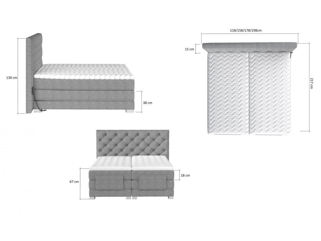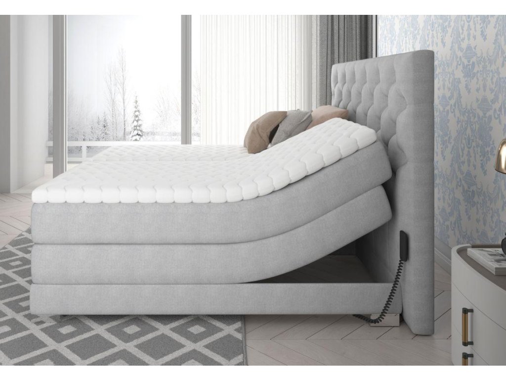 Postel Boxspring CLOVER s elektrickým polohováním nabízí výjimečný komfort a moderní design pro dokonalý noční odpočinek. Dvojlůžko Boxspring s elektrickým polohováním a dvěma druhy matrace - taštičkovou a bonellovou, plus topperem, zajišťuje maximální podporu a dokonalou ergonomii těla během spánku. S výškou 67 cm a hypoalergenním potahem matrace, Boxspring CLOVER je ideální volbou pro každou ložnici. Dostupné rozměry včetně jednoho lůžka jsou 90x200 cm, 140x200 cm, 160x200 cm a 180x200 cm, s tvrdostí matrace H3 - bonnell. Zvýhodněte si klidný spánek s tímto luxusním dvojlůžkem s elektrickým polohováním.