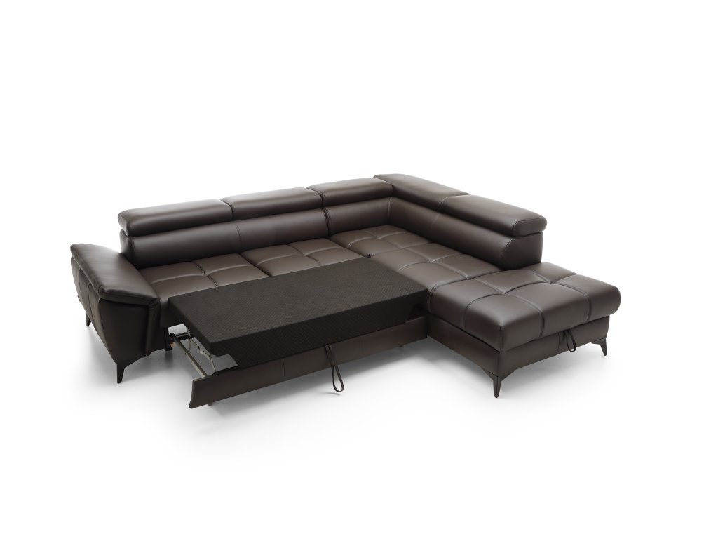 Elegantní a funkční rohová sedací souprava s jednoduchými liniemi a jemným prošíváním. Vybavena pohyblivými opěrkami hlavy a rozkládacím systémem Delfin pro spaní. Obsahuje úložný prostor. K dispozici v několika materiálech a barvách. Rozměry 265 x 222 x 75/95 cm.