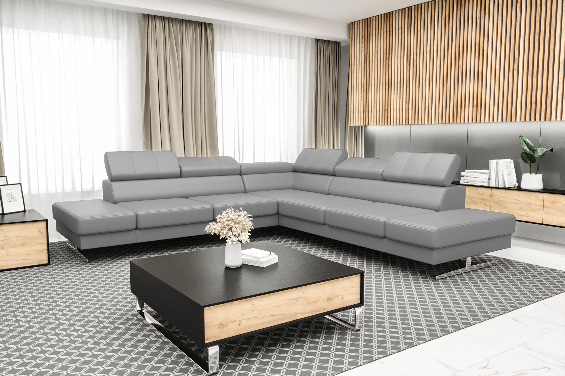 Luxusní rohová sedací souprava EMPORIO MAX z pravé kůže nabízí polohovatelné opěrky hlavy, vysoké kovové nožky a prvotřídní ergonomické sezení díky elastické pěně T35 a HR. Vyniká silným prošíváním a možností výběru z několika typů kůží.