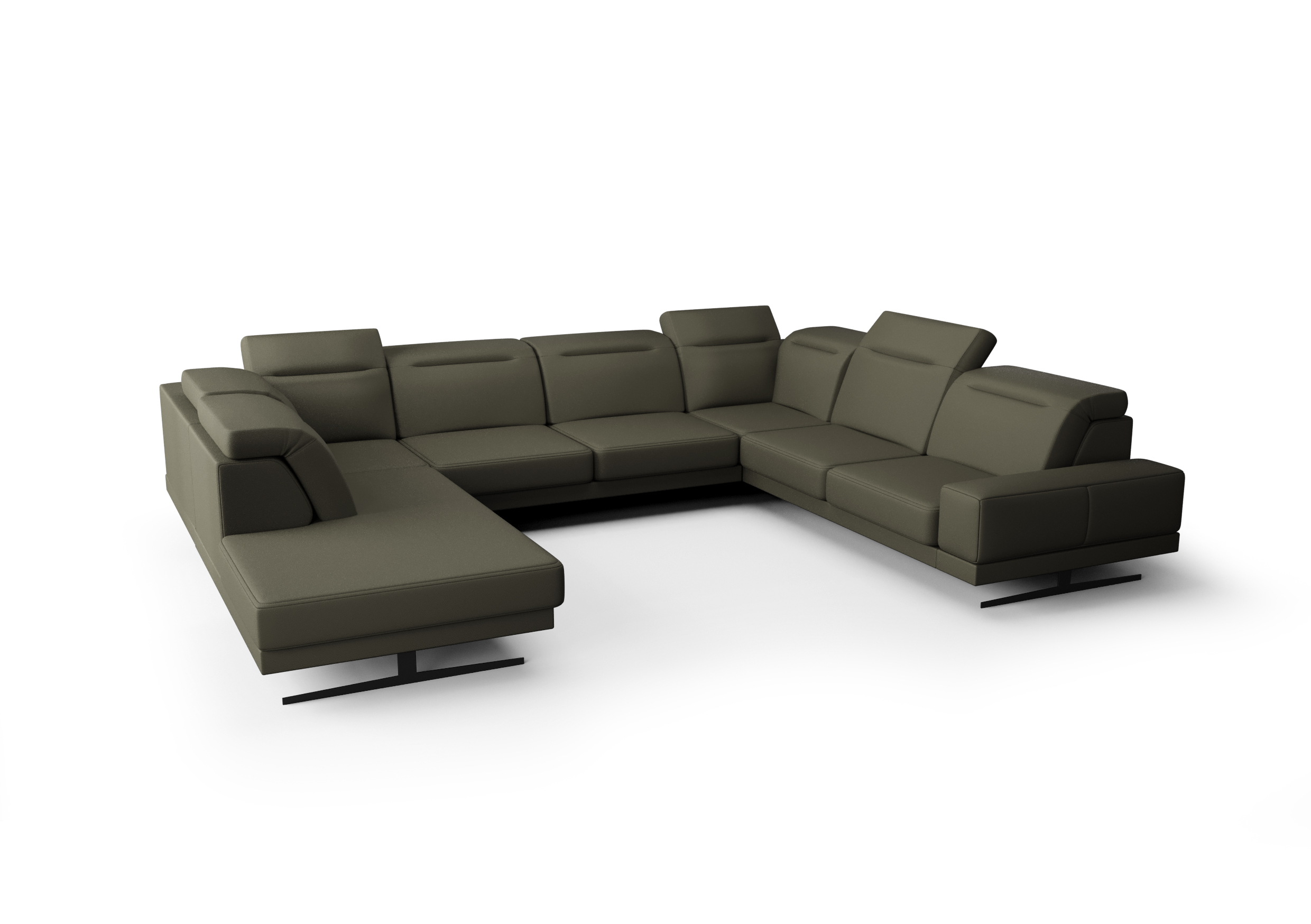 Moderní kožená rohová sedačka Fiore MAX I v provedení do U s délkou 350 cm. Vyniká vysokými kovovými nožkami, polohovatelnými opěrkami hlavy a kvalitním sedákem s vlnitými pružinami a pěnou T35.