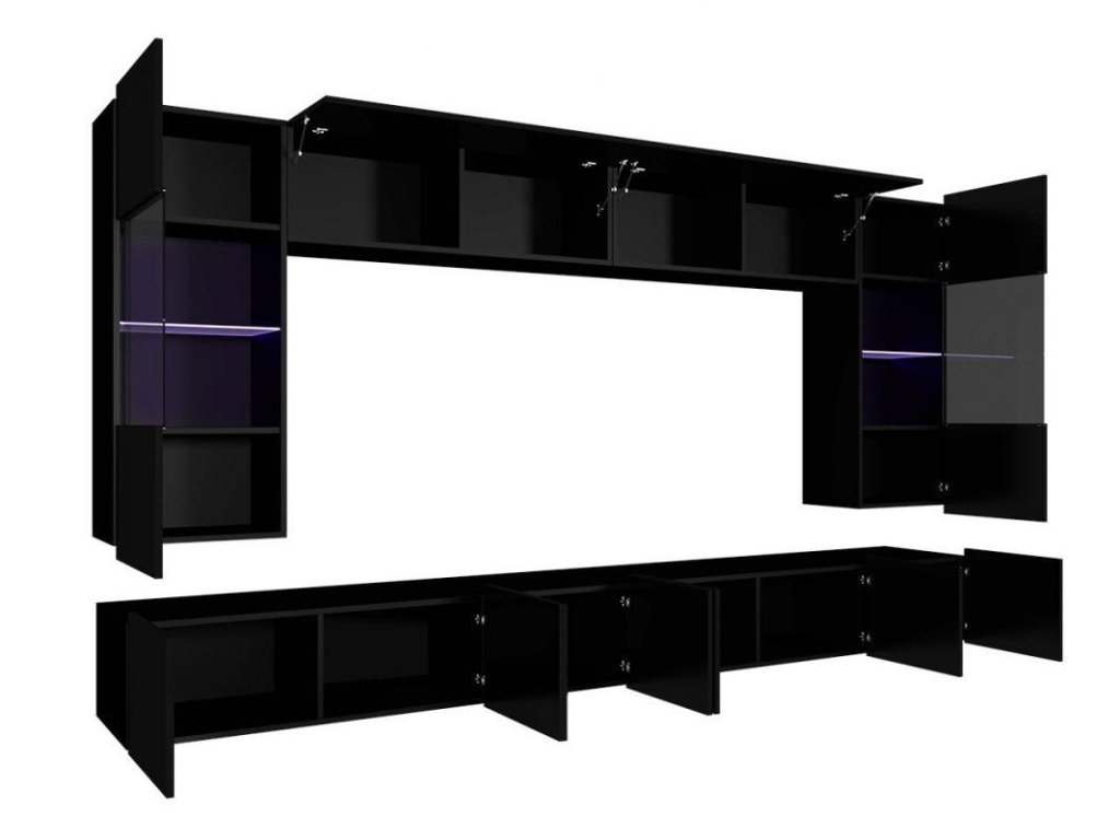 Moderní obývací stěna Calabrini v černém provedení. Horní plné skříně s otevíráním systémem ramen CLICK.
