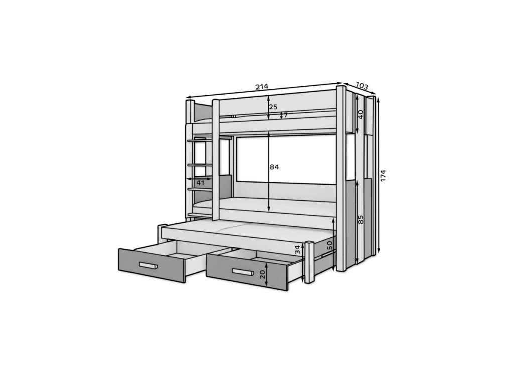Patrová postel Artema má rozměry 200 x 90 cm a je vhodná do malých dětských pokojů, kde šetří místo. Konstrukce postele je vyrobena z kvalitního masivního dřeva, které zajišťuje stabilitu a bezpečnost. Postel je určena pro 3 osoby. Horní lůžko snese zatížení do 150 kg a spodní lůžko do 200 kg. Součástí jsou pohodlné schůdky pro bezpečný výstup na horní lůžko. Obě lůžka mají výklopné lamely pro pohodlný přístup ke dvěma prostorným zásuvkám, kam se vejdou deky, polštáře a další ložní prádlo.