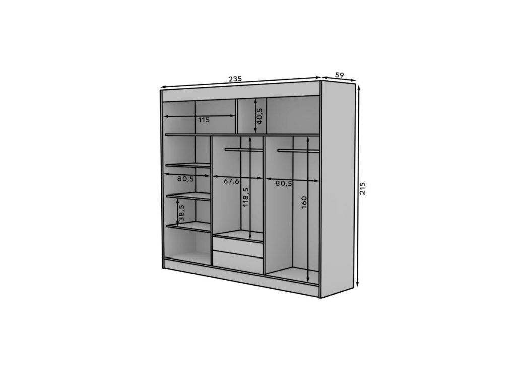 Uvnitř posuvné skříně Erwin najdete dostatek police a tyčí na zavěšení oblečení či dalších drobností. Police jsou prostorné a umožňují složit na ně například svetry, trička, tepláky či punčochy. Tyče jsou určeny pro zavěšení šatů, kabátů, sak, šatů či košil. Vše je přehledně uspořádáno a máte tak dokonalý přehled o svém oblečení. Skříň Erwin je vnitřním prostorem připravena pojmout opravdu velké množství věcí. Variabilitu umístění polic a tyčí pak můžete upravit podle aktuální potřeby a složení své garderoby.