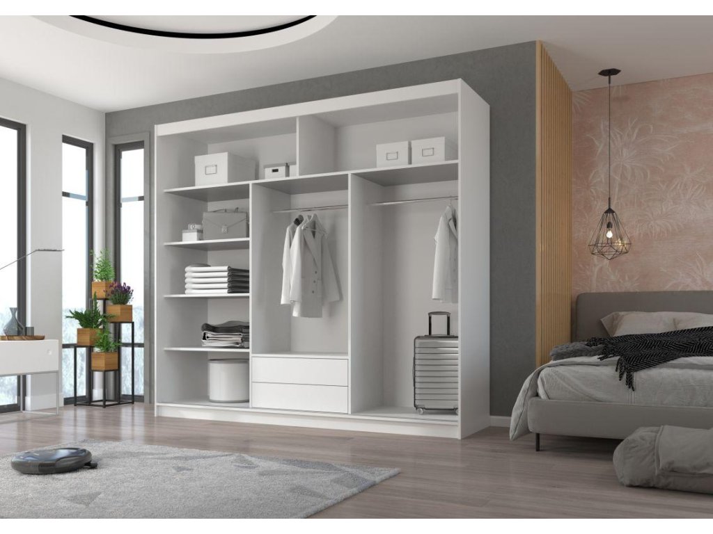 Posuvná skříň Erwin zaujme svým moderním a nadčasovým designem, který ladí s jakýmkoliv moderním či klasickým interiérem. Díky bílé barvě a čistým liniím působí vzdušným a elegantním dojmem. Skříň rozhodně vynikne v ložnici, šatně, na chodbě i v obývacím pokoji. Lze ji umístit jako solitérní kus nábytku nebo ji zakomponovat do sestavy skříní. V každém případě bude tvořit dominantní prvek prostoru a skvěle v něm vynikne. Jedná se o nadčasový nábytek, který má dlouhou životnost a hodí se tak do moderních i klasických interiérů.