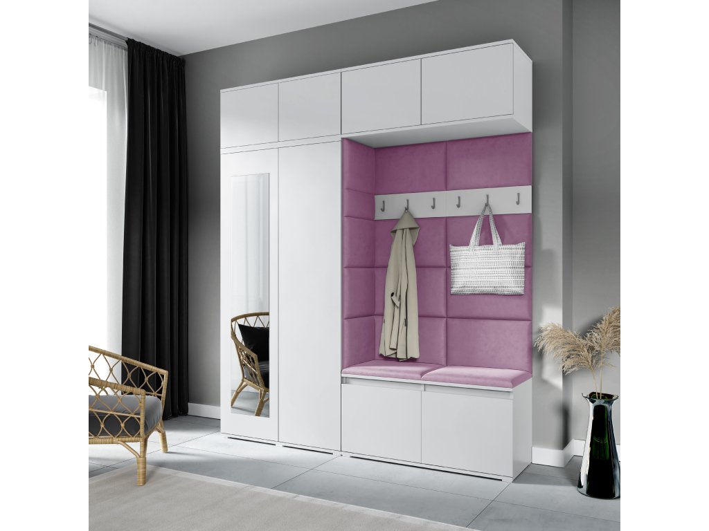 Předsíňová stěna EMI je opatřena exkluzivními čalouněnými panely potaženými kvalitní látkou v různých barvách. Ty dodají vaší předsíni nádech luxusu a můžete si vybrat odstín dle vašeho interiéru.