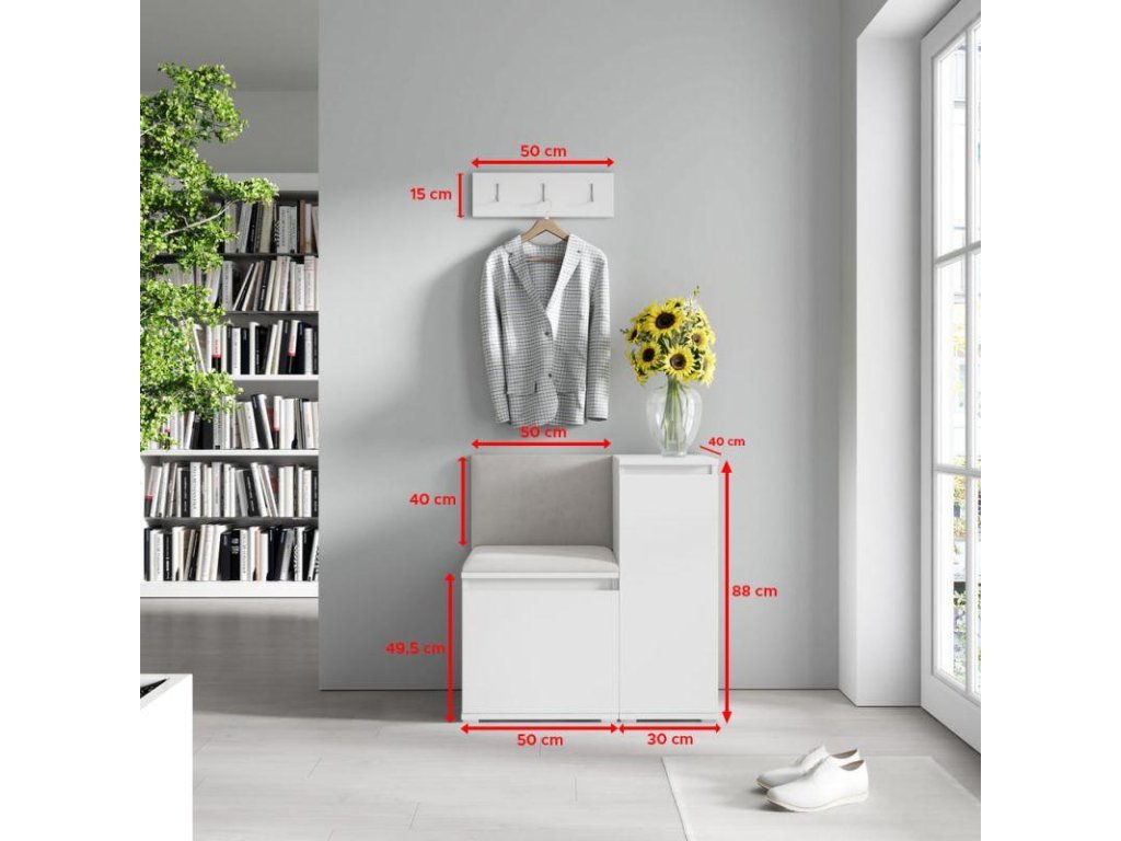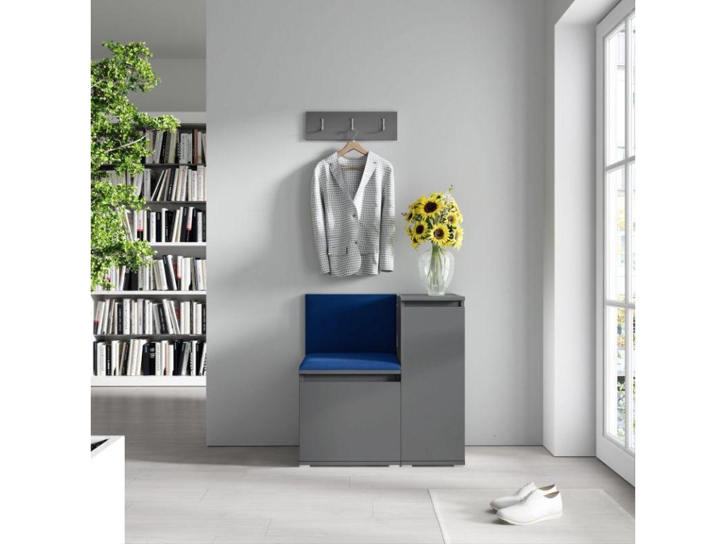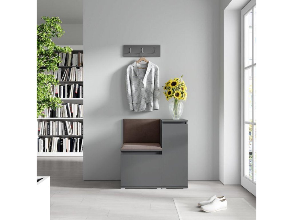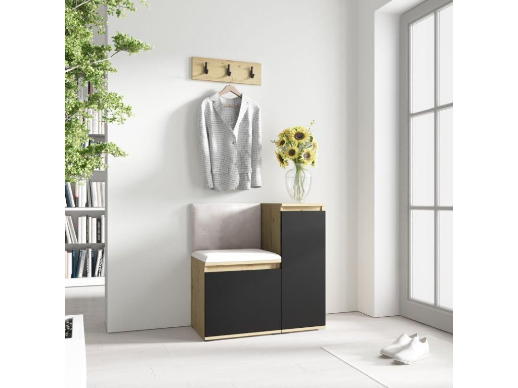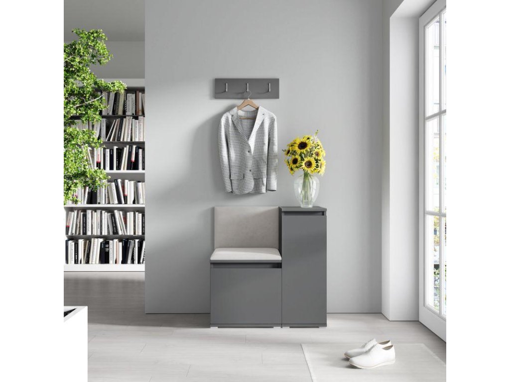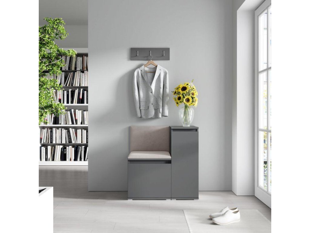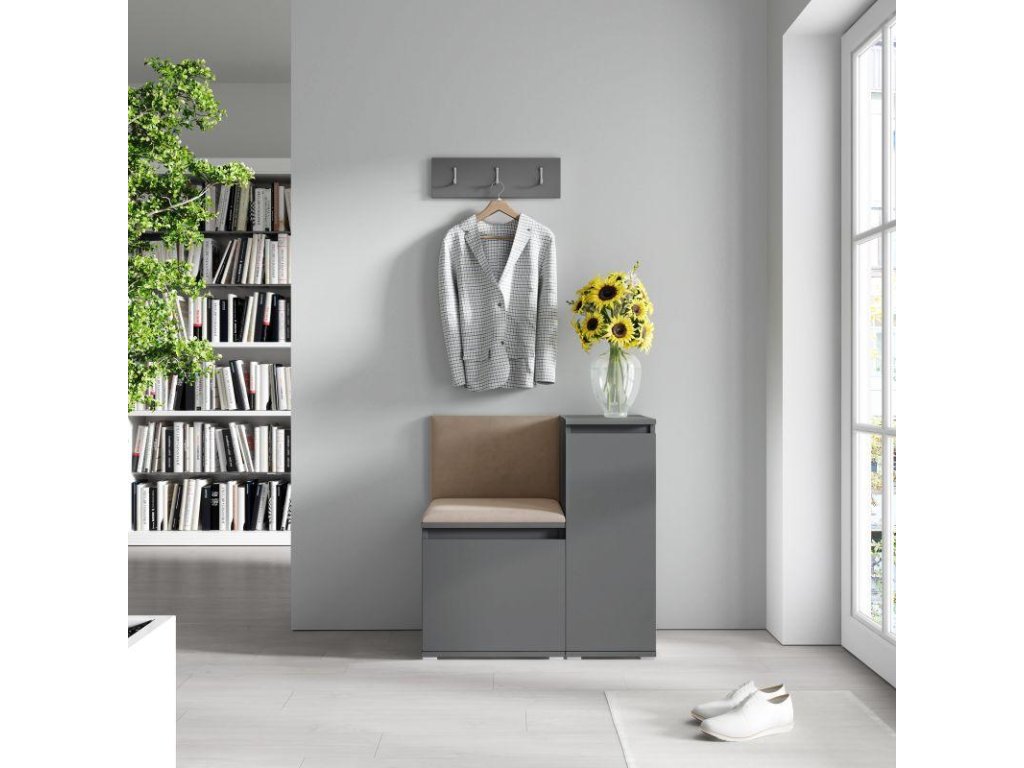 Předsíňová stěna EMI 30 představuje elegantní řešení pro útulnou předsíň s dostatkem úložného prostoru. Obsahuje jednodvéřovou komodu, botník, věšák a čalouněné panely v různých barvách. Dvířka botníku se otevírají systémem Push to open. Stěna je dodávána v demontu s návodem. ABS hrana chrání před poškozením.