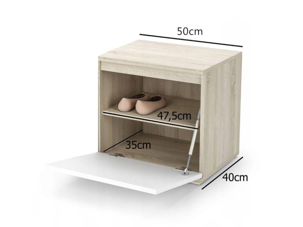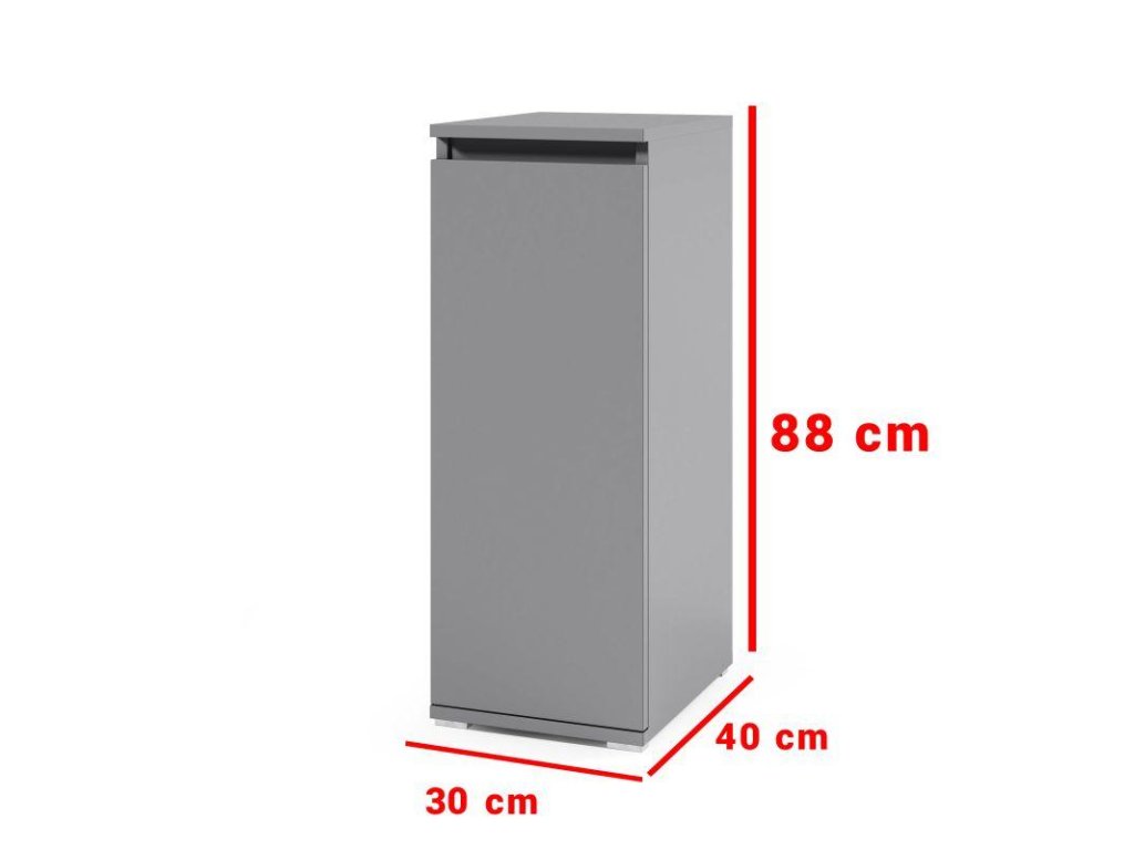 Dvířka botníku se otevírají pomocí systému Push to open. Pro pohodlné otevření a zavření dvířek tak stačí jen lehký dotek. Úzká jednodvéřová komoda s policemi navíc poskytuje další úložný prostor.