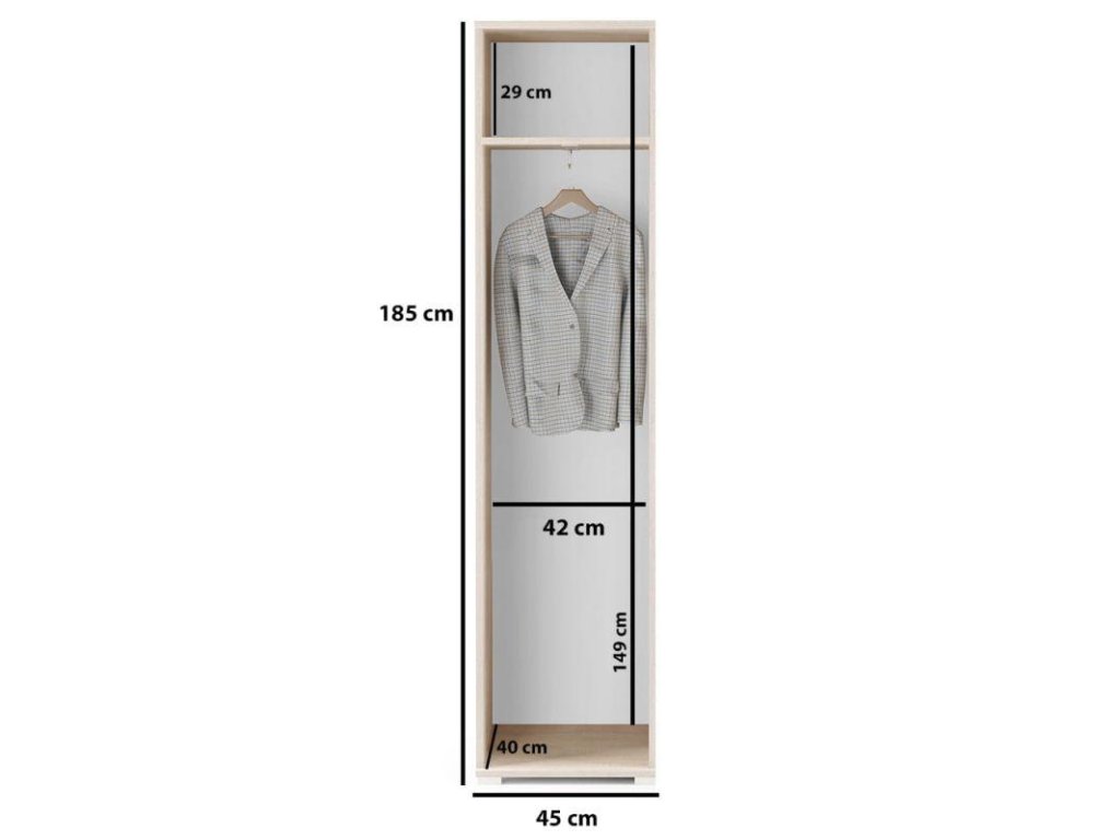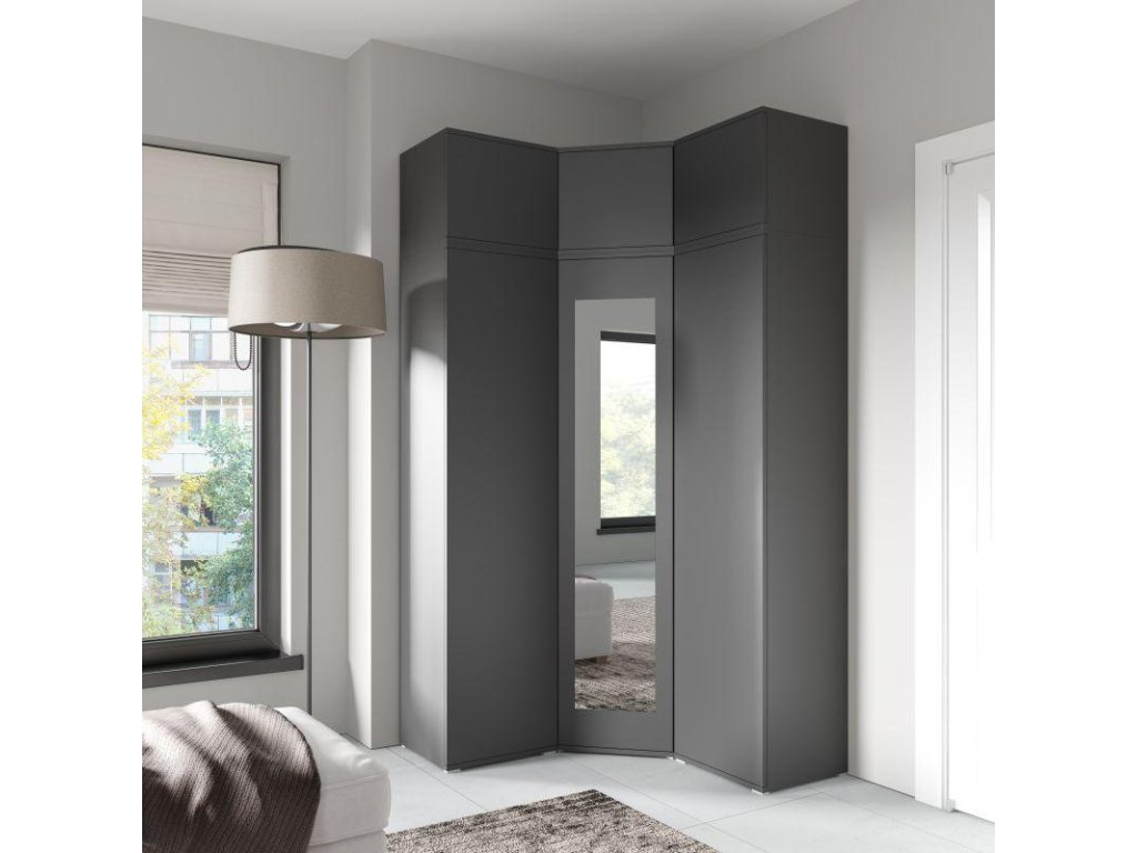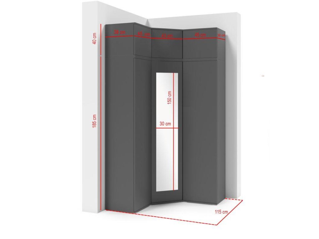 Dominantní prvek sestavy tvoří rohová skříň se zabudovaným zrcadlem. Zrcadlo opticky zvětšuje prostor a dodává lehkost. Skříň poskytuje dostatek úložného prostoru na oděvy, obuv a další potřeby.