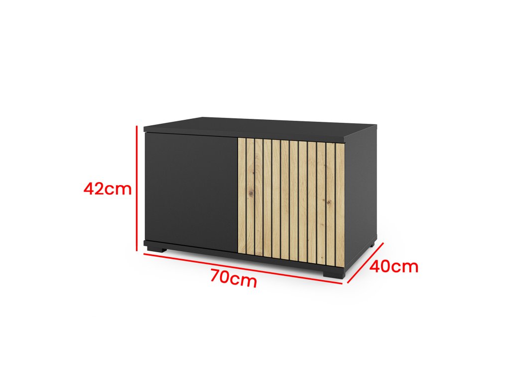 Předsíňová stěna ROSS 4 je perfektním řešením pro ty, kteří hledají moderní a stylový doplněk do svého interiéru. Její nadčasový design v kombinaci černého matného povrchu a dekoru dubu vytváří sofistikovaný vzhled, který zaujme na první pohled. Lamelované doplňky pak dodávají stěně moderní nádech a podtrhují její eleganci.