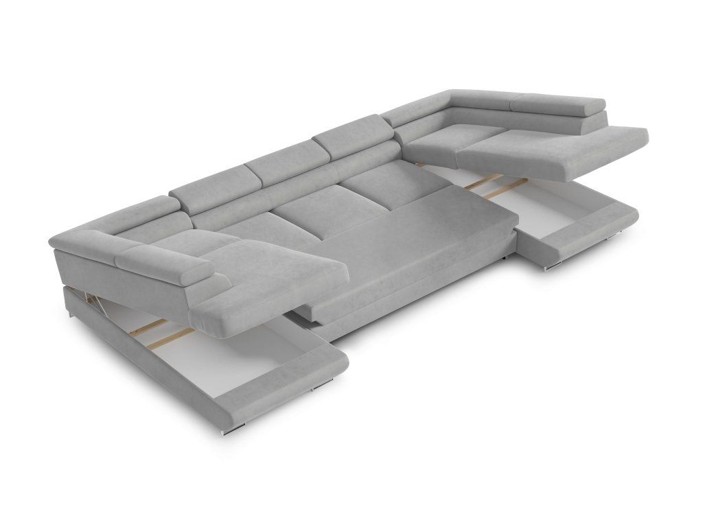 Souprava disponuje rozkládací funkcí, díky které ji snadno proměníte na lůžko pro přespání. Praktickým benefitem jsou také dva úložné prostory na lůžkoviny. Nastavitelné záhlavníky umožňují přizpůsobit si pohodlí přesně podle vašich potřeb.