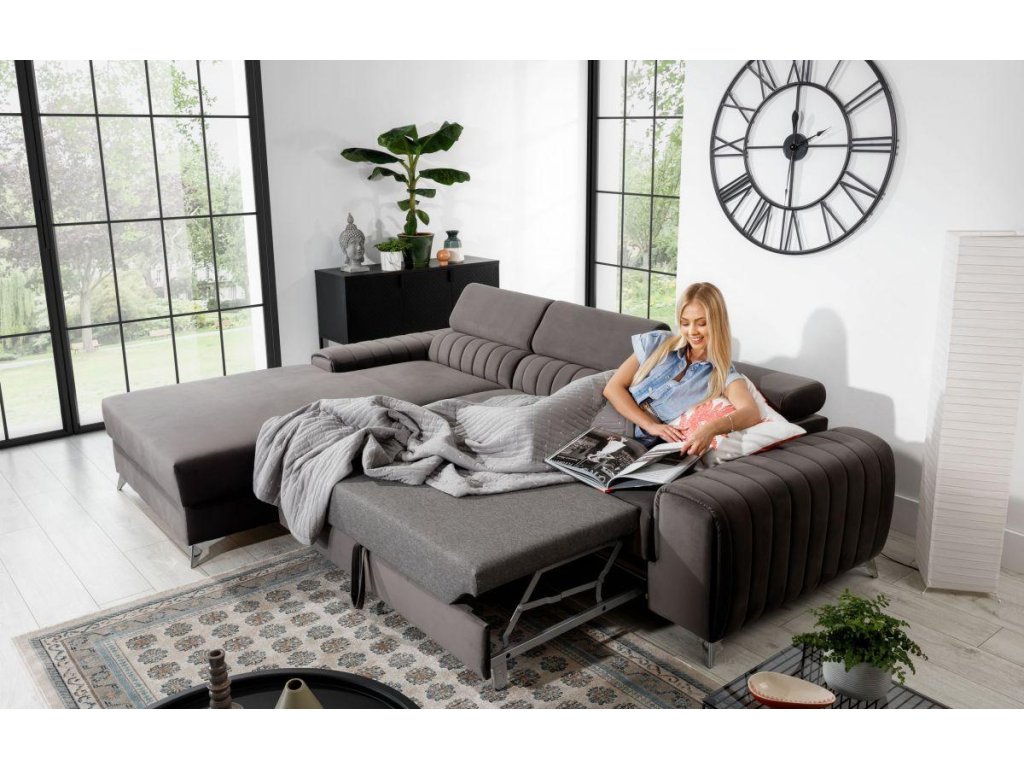 Pohodlná a praktická rohová sedací souprava Grayson promění vaši obývací místnost v luxusní prostor. Díky rozkládacímu mechanismu "delfín" se snadno přemění na prostorné lůžko pro hosty. Obsahuje úložný prostor na lůžkoviny a je vyrobena z odolných materiálů s inovativní pěnou T30+HR zajišťující pružnost. Nastavitelné opěrky hlavy a ergonomická opěradla dodávají maximální pohodlí. Moderní designový kousek, který dodá styl i funkčnost.