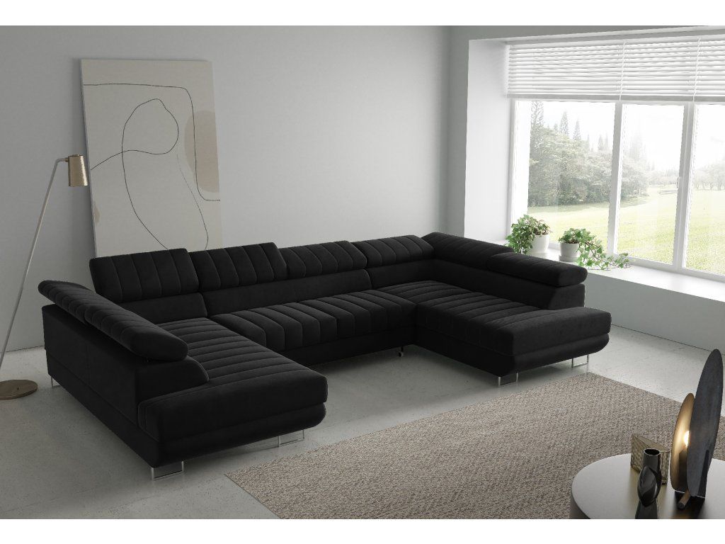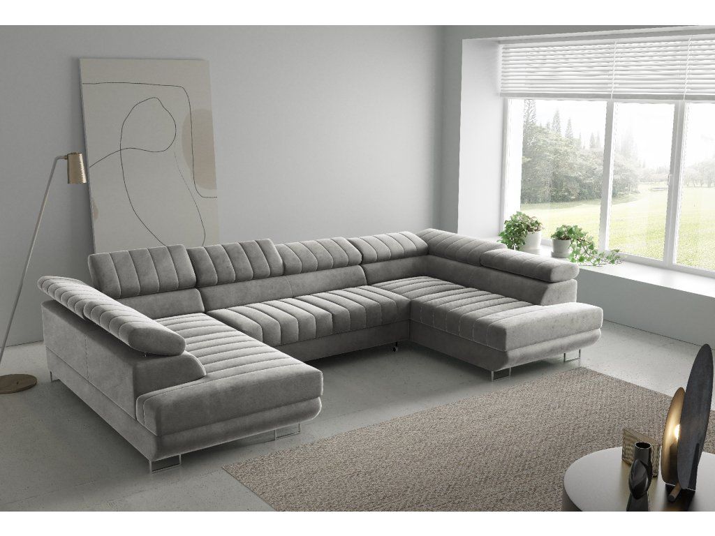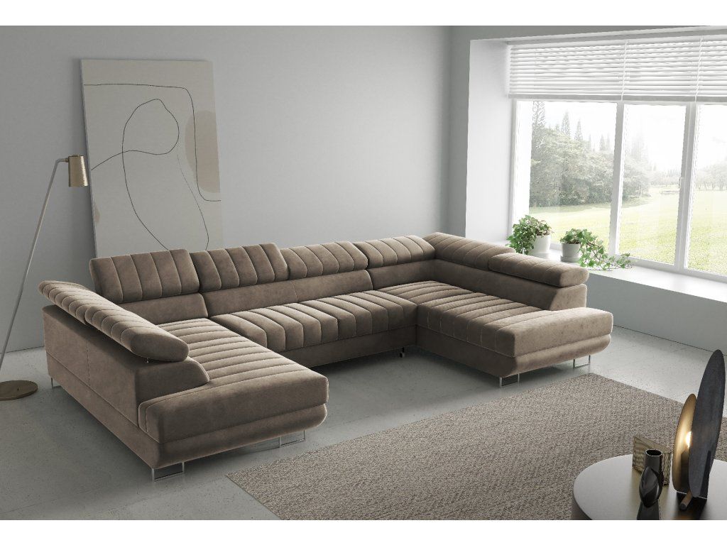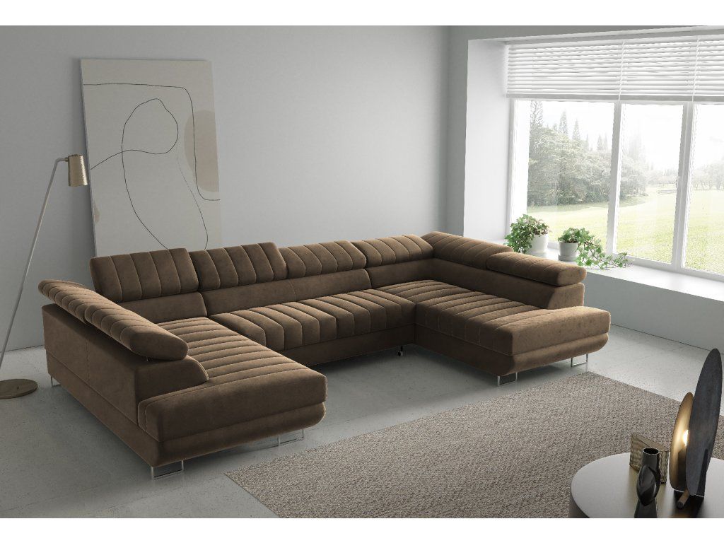 Rohová sedací souprava Horizonte U nabízí moderní design, vysoký komfort a praktické funkce. Díky rozkládání typu Delfin snadno vytvoříte lůžko, nechybí ani úložný prostor a nastavitelné opěrky hlavy pro maximální pohodlí.