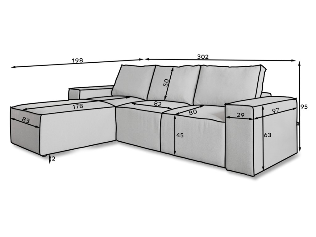 Konstrukce sedací soupravy je navržena s důrazem na pohodlí i dlouhou životnost. Komfortní sedák poskytuje stabilní oporu při sezení, zatímco měkké opěrné polštáře zvyšují celkový komfort. Čalouněná zadní strana umožňuje umístění sedací soupravy i volně do prostoru, nejen ke stěně.