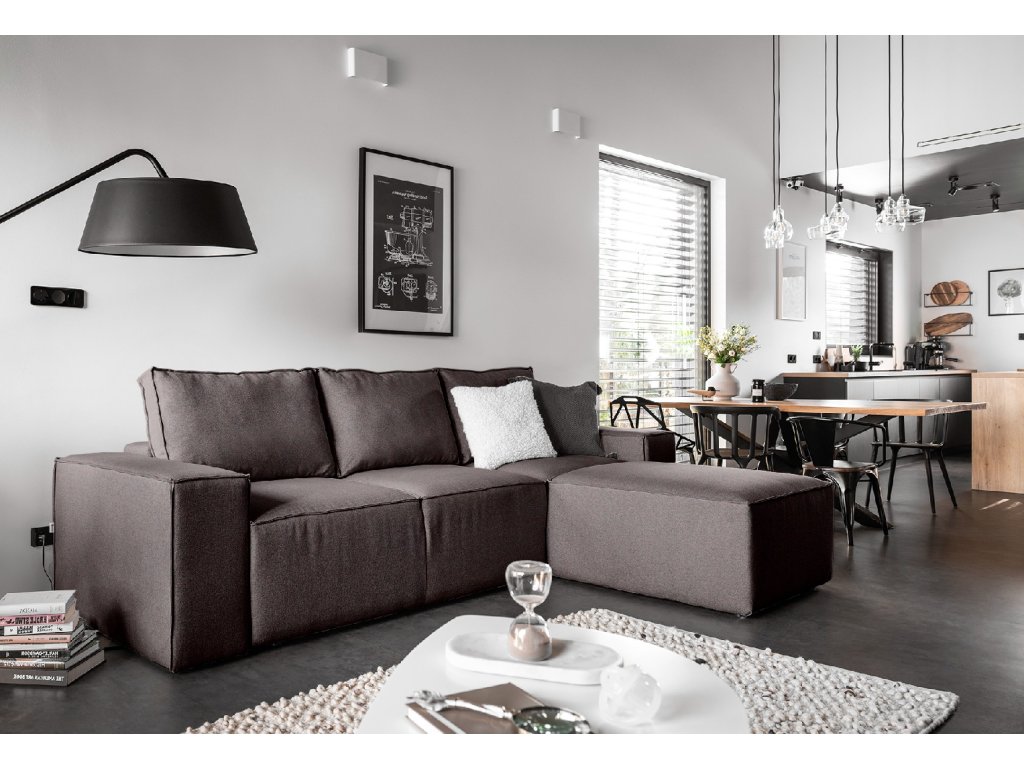 Moderní rohová sedací souprava Silla – pravý roh v látce Grande 65 je prostorná a pohodlná, s funkcí rozkladu na spaní a praktickým úložným prostorem. Ideální volba do obývacího pokoje pro každodenní sezení i občasné přespání.